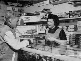Into the mid 1950's we see what a Hobby Shop looked like. A ready-to-fly Firebaby is on counter with assembly sets on the shelf behind. Also notice the late model Fireball on the top shelf. On the far lower right is a box of '74 Fighters. |