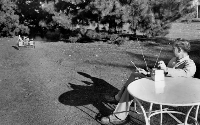 Chuck Hein photo of Jim Walker relaxing while the Radio Controlled Lawnmower works for him. |